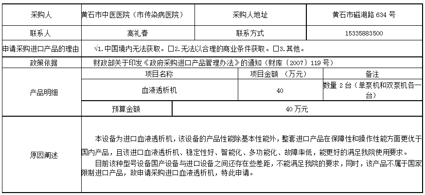 根據(jù) 黃石市中醫(yī)醫(yī)院(市傳染病醫(yī)院)血液透析機(jī)采購(gòu)項(xiàng)目 的需要,擬采購(gòu)進(jìn)口設(shè)備,預(yù)算金額為40萬(wàn)元,數(shù)量2臺(tái)(單泵機(jī)和雙泵機(jī)各一臺(tái))。現(xiàn)將申請(qǐng)采購(gòu)進(jìn)口產(chǎn)品的專家論證意見(jiàn)進(jìn)行公示,公示期為五個(gè)工作日。若在公示期間對(duì)專家組論證意見(jiàn)持有異議,請(qǐng)用書(shū)面方式將相關(guān)意見(jiàn)和依據(jù)報(bào)送采購(gòu)單位。