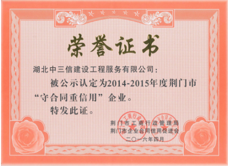 2016年7月,湖北中三信建設(shè)工程服務(wù)有限公司分別榮獲湖北省、荊門市第十三屆“守合同、重信用”榮譽(yù)稱號。
